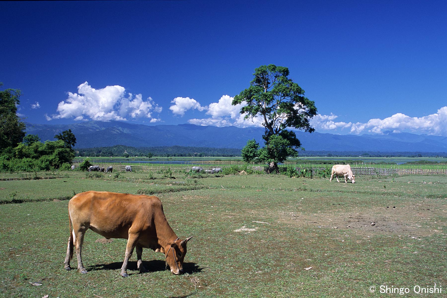 Photo 022By Shingo Onishi / 2025年8月31日 Cattle grazing on the east bank of Chindwin River, Sagaing Region, Oct. 2004 チンドウィン川東岸で草を食む牛たち
