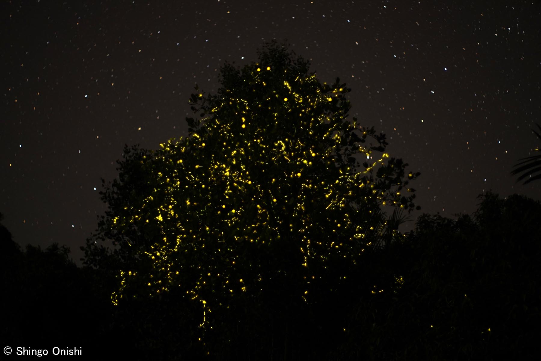 まるでクリスマスツリー、ホタルに覆われたマングローブの木